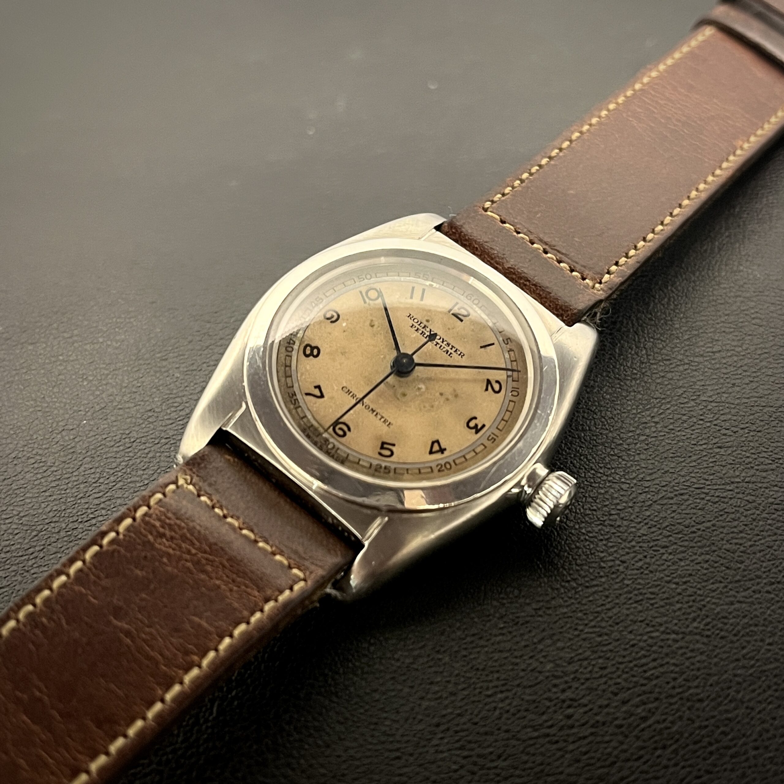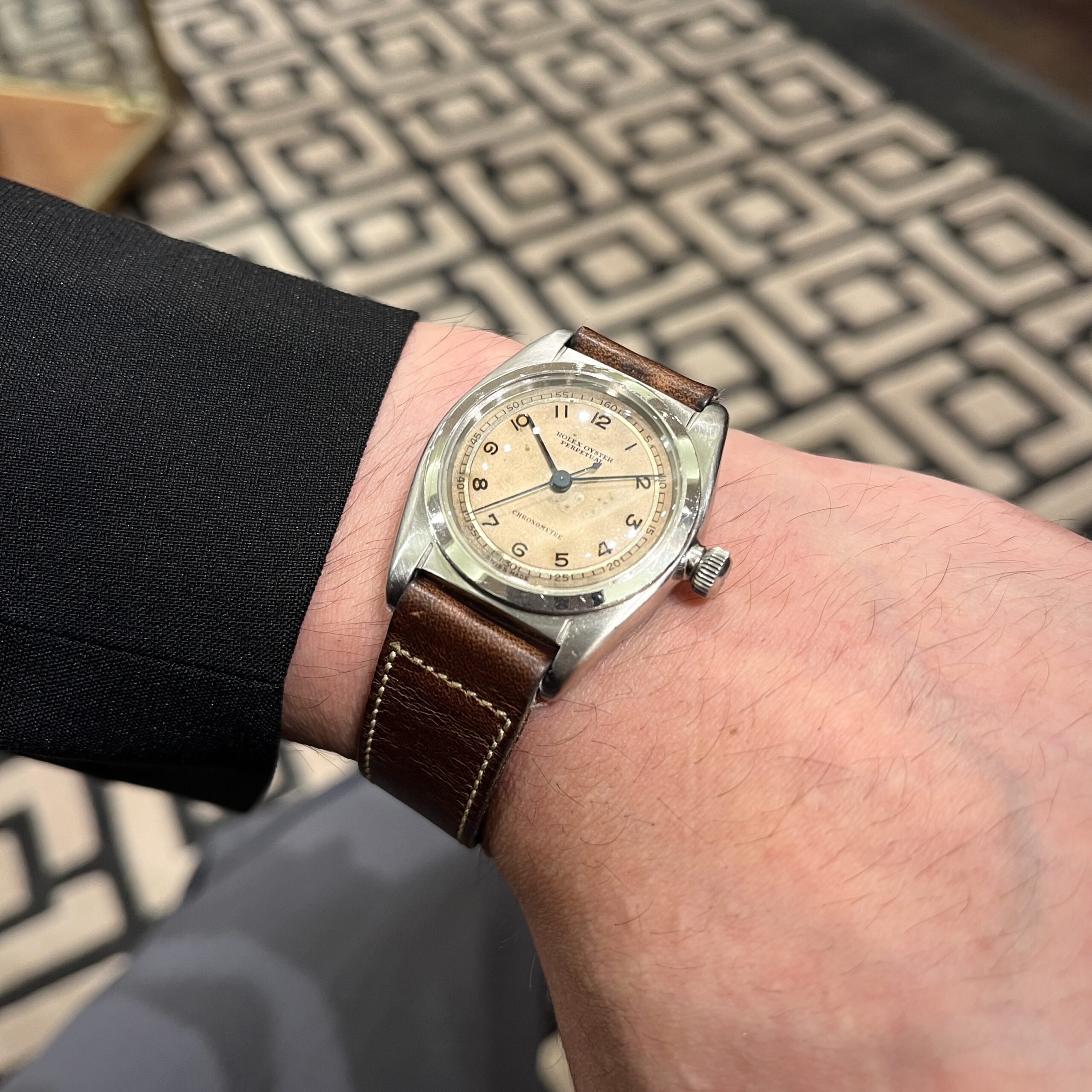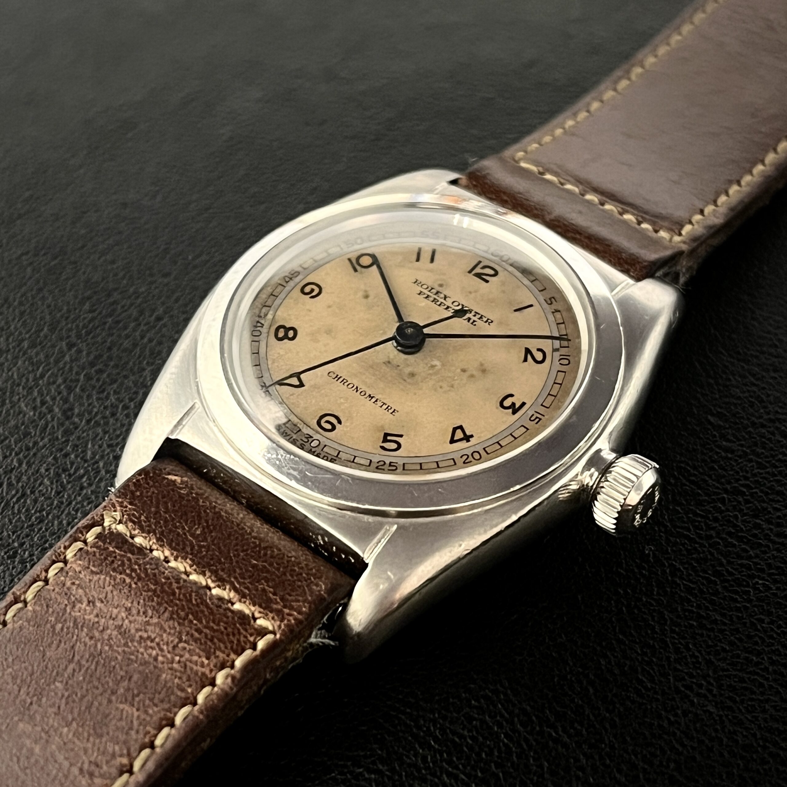 ダイヤルはペイントの全アラビアに外周はルーレット、針は青焼きのバーハンド。(写真では黒く見えますが実際には青)バブルバックのそのケース形状とは裏腹に、数字の書体や針の細さなど繊細なデザイン。