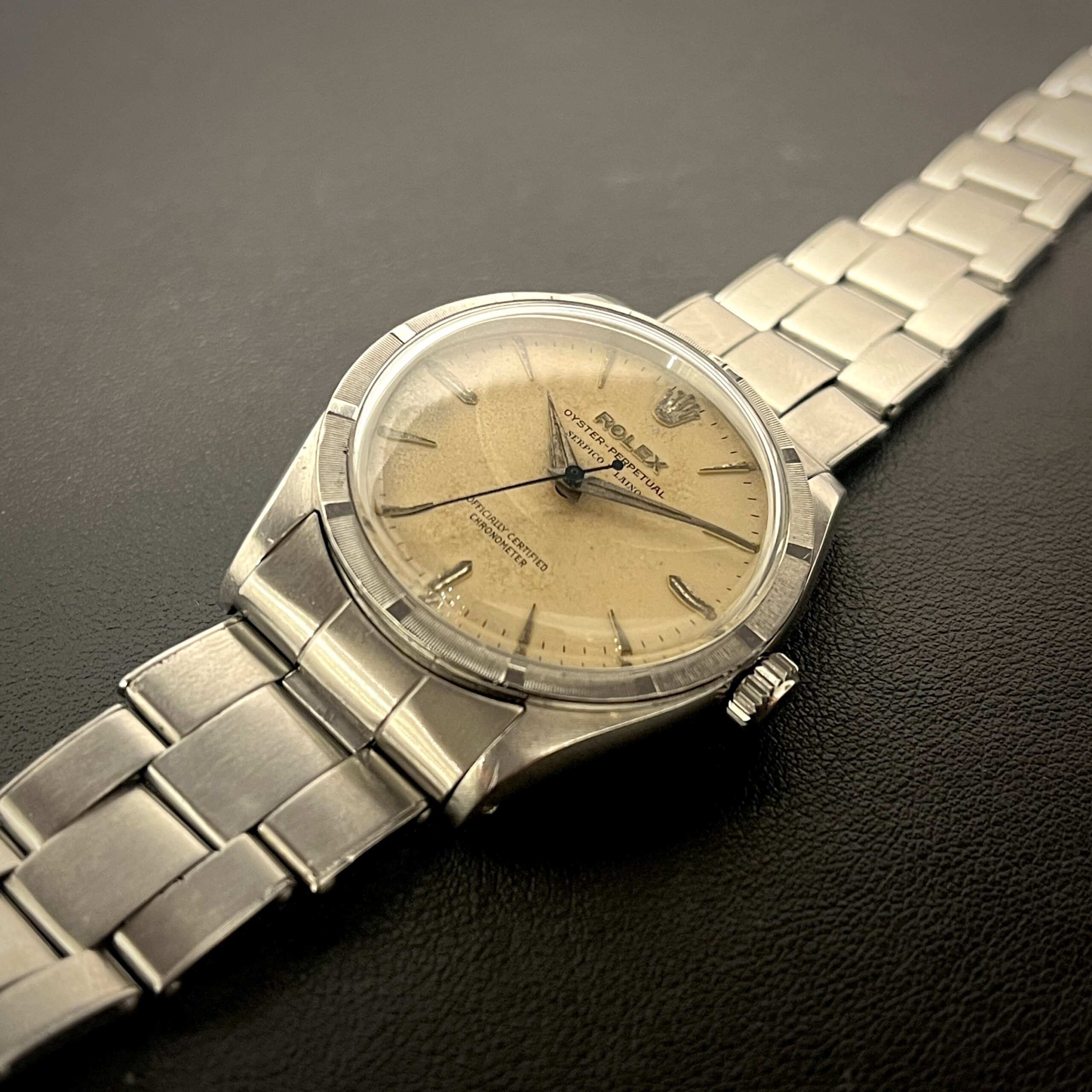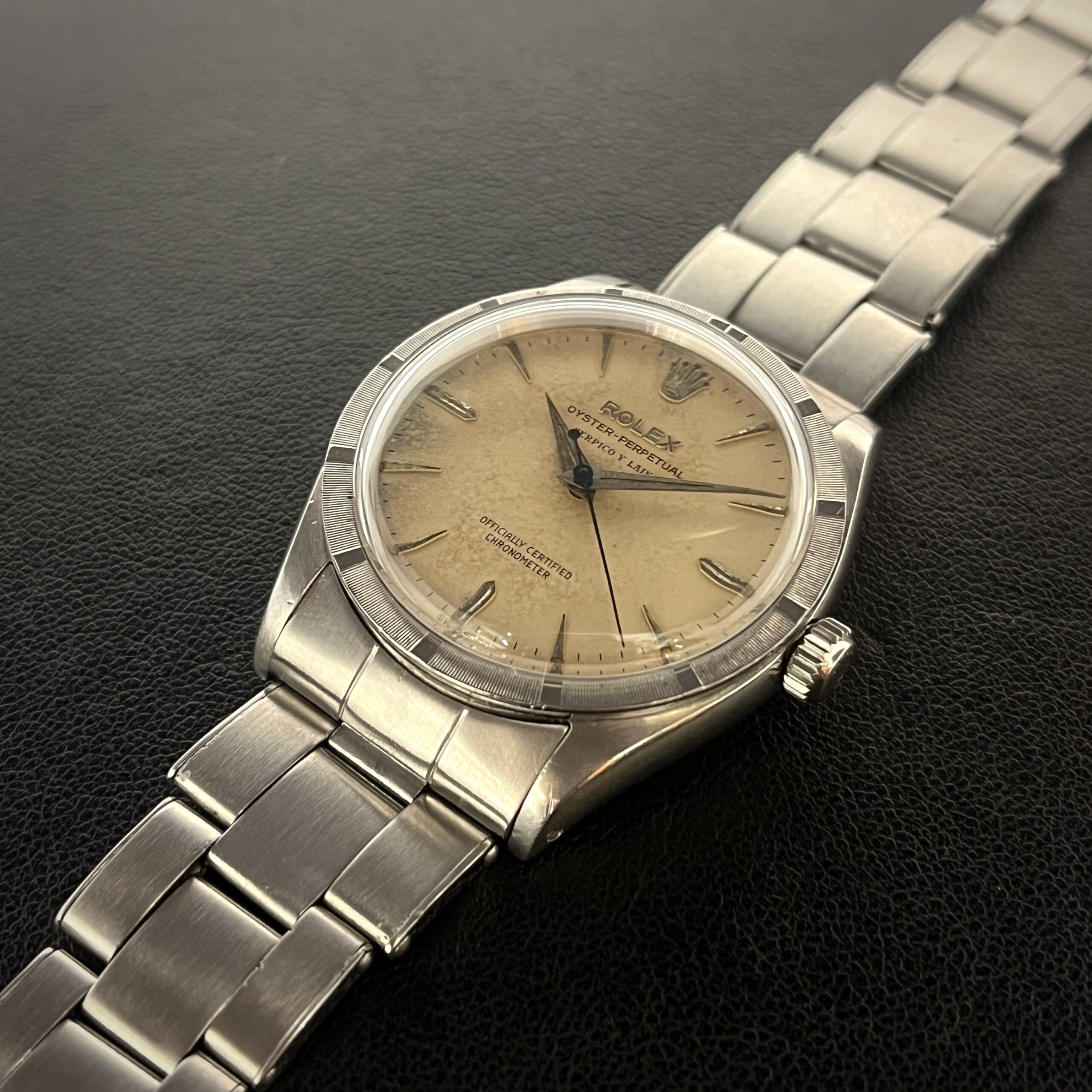 エンジンターンドベゼルにこのエイジング。ロレックスロゴもプリントではなくアプライドになります。ドルフィンハンドに青焼きの秒針。完璧な組み合わせですね。