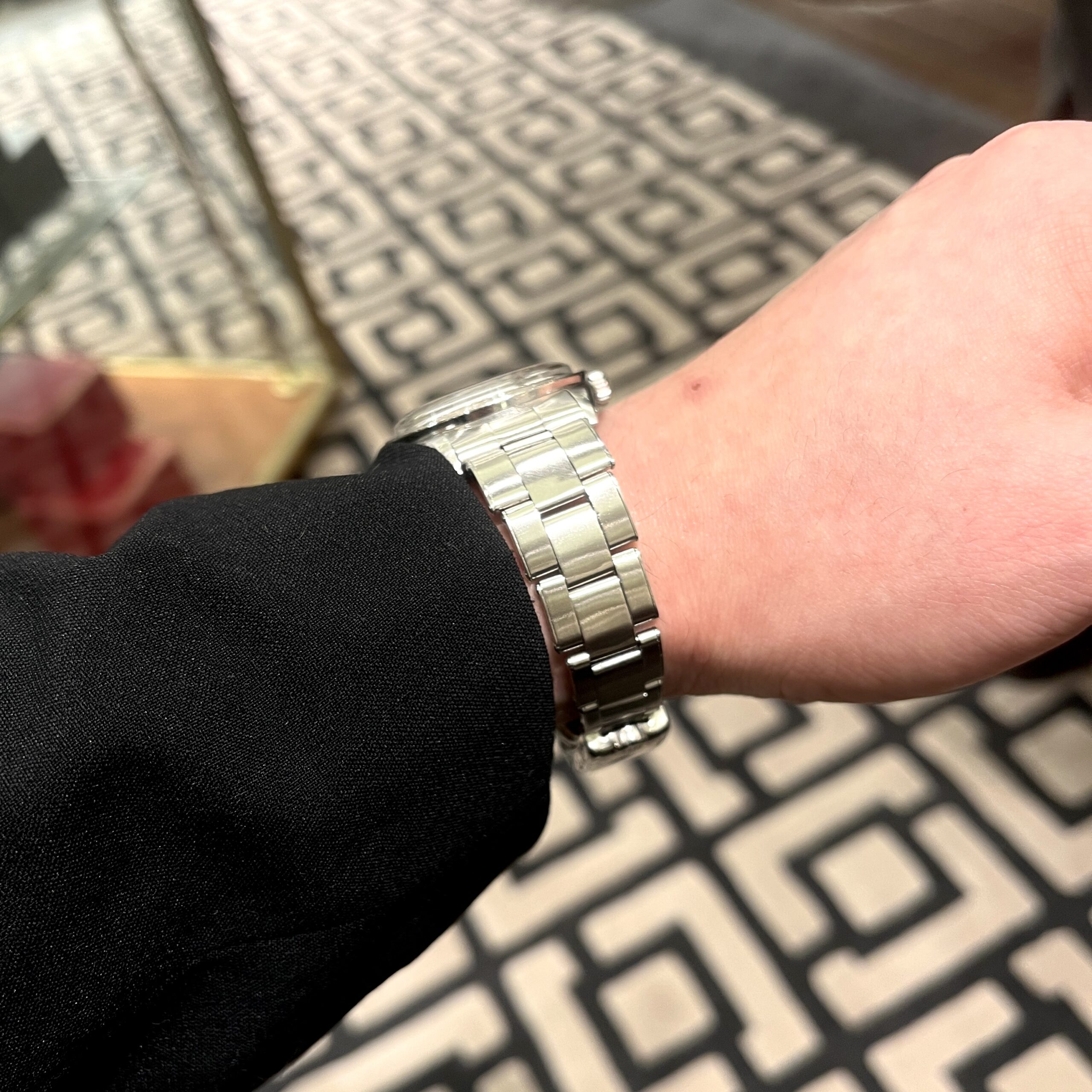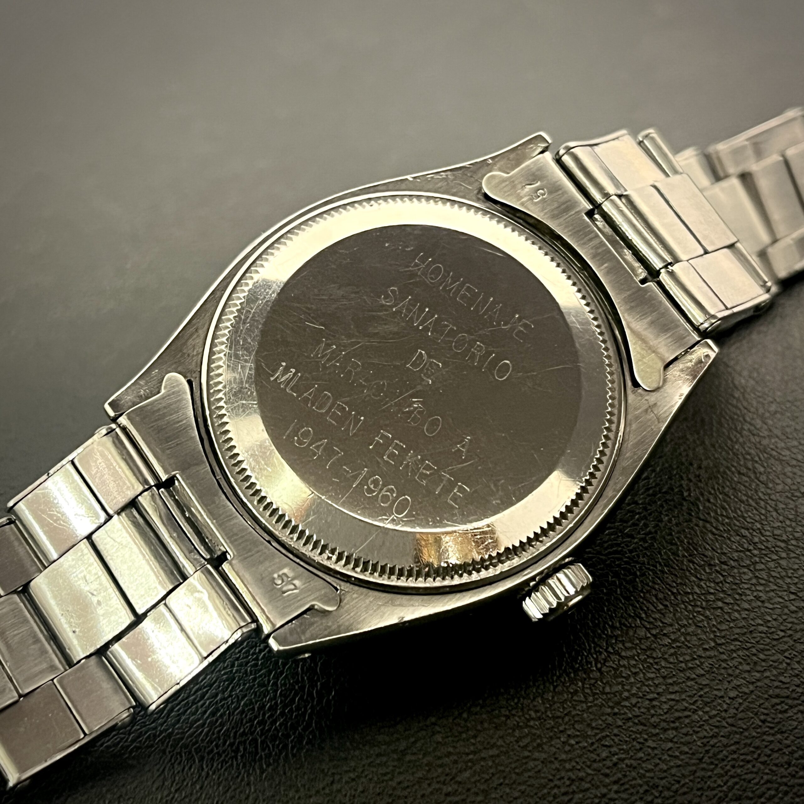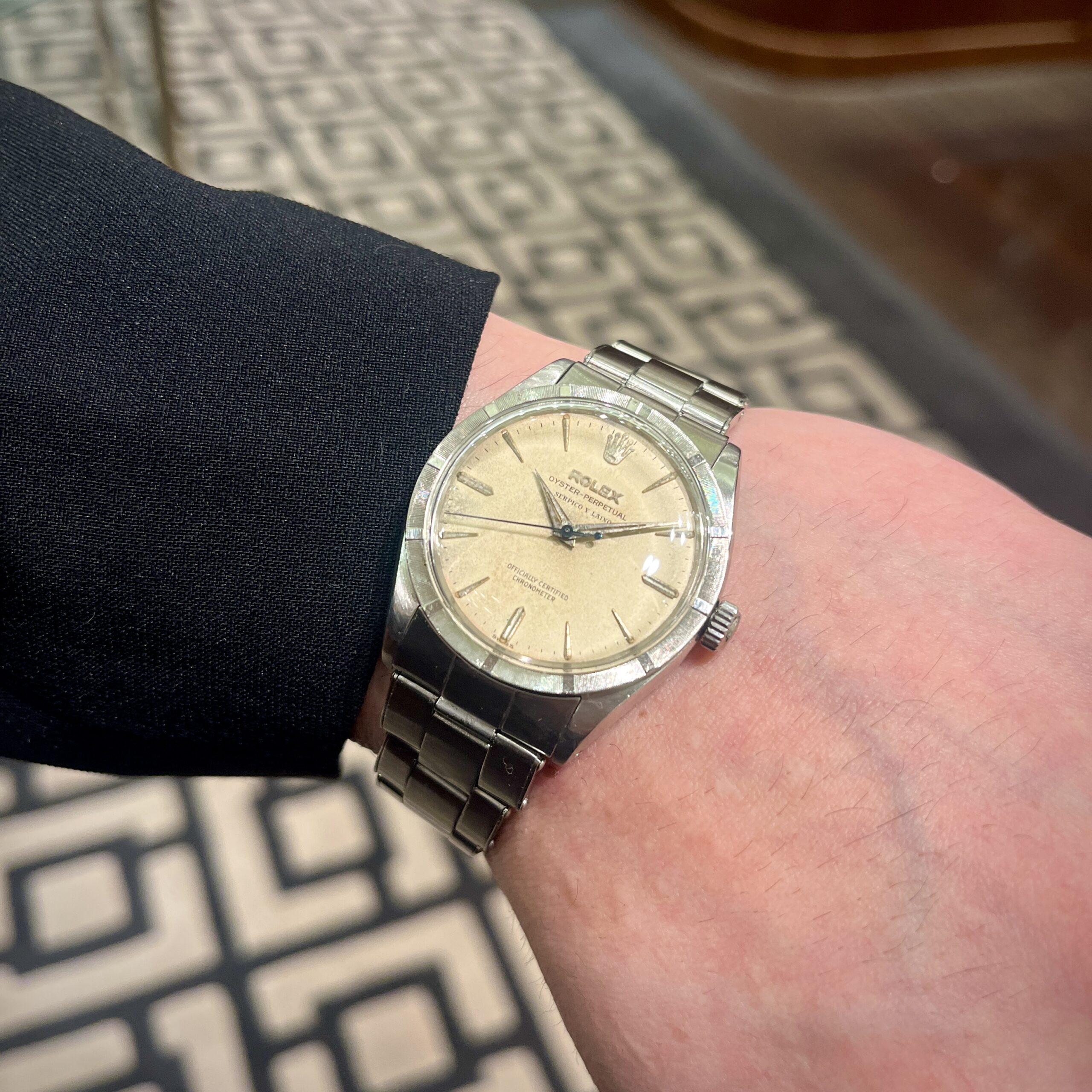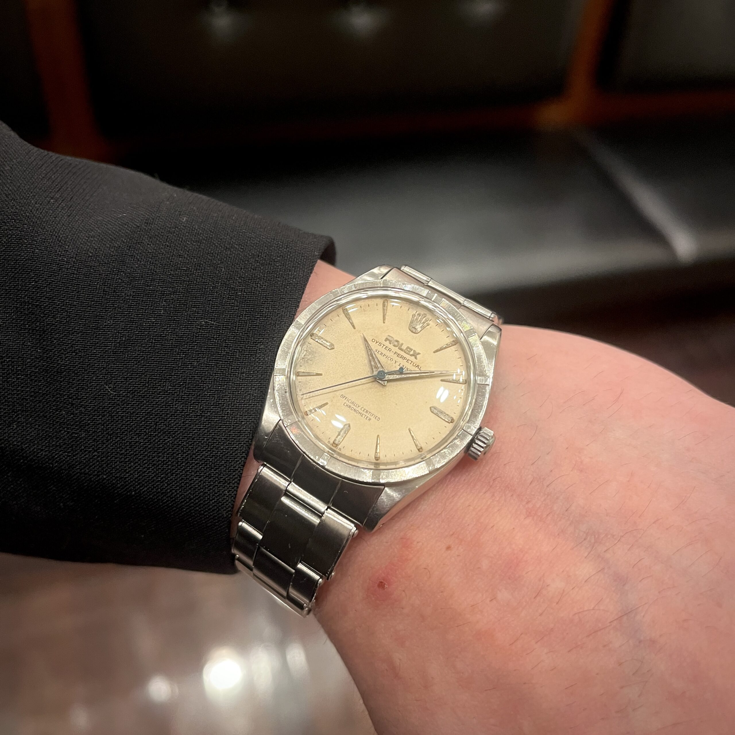 モデルは34mmのオイスターパーペチュアル。ベゼルはファンの多いエンジンターンドベゼル。ダイヤルはベネズエラの高級宝飾店「セルピコ」のダブルネームになります。セルピコのダブルネームはパテック等でも見かける事がありますが、軒並み高額な場合が多いですね。私はティファニーのダブルネームより断然セルピコの方が好きです。